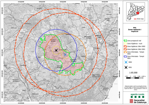 Los servicios veterinarios oficiales tuvieron conocimiento de la detección de dos cadáveres de jabalí silvestre y a una distancia aproximada de 1 km entre ambos, en las inmediaciones del campus de la Universidad Autónoma de Barcelona. Se ha activado el manual práctico de operaciones de lucha contra la PPA, que supone la delimitación de la zona infectada, búsqueda activa y eliminación bajo control oficial de cadáveres de jabalíes silvestres, prohibición de caza en la zona con objeto de evitar el movimiento de jabalíes hacia zona libre, restricción de actividades de carácter no esencial, refuerzo de vigilancia pasiva y medidas de bioseguridad en explotaciones porcinas, visita oficial a las mismas, entre otras.